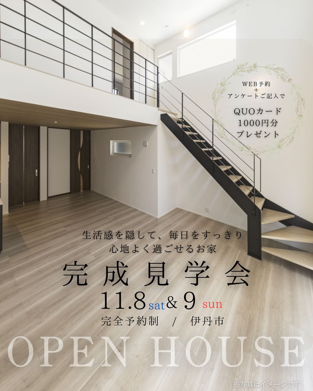 【生活感を隠して、毎日をすっきり心地よく過ごせる家】 兵庫県伊丹市にて完成見学会を開催! 時間は10:00~17:00です。 完全予約制の為、是非ご予約してからお越しください。 ▷WEB予約+アンケートご記入でQUOカード1000円分プレゼント!