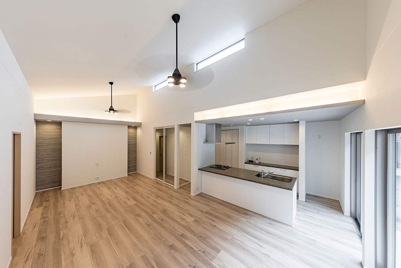 LDKでは、大型の勾配天井に窓を設け、明るく開放的で【ONE STORY】ならではのキッチンが一際高級感を際立たせます。