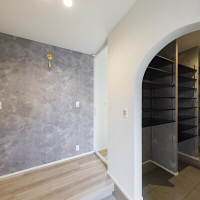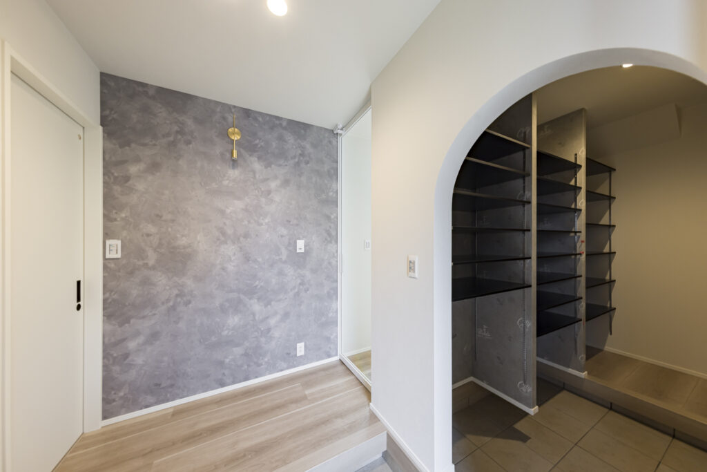 玄関を入ると、高級感溢れるアクセントクロスとR垂れ壁のシューズクロークがあり 利便性だけでなく、来客時にも自慢のスペースとなりそうです。