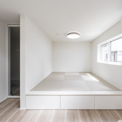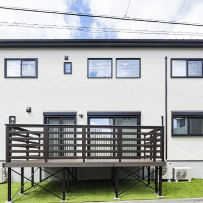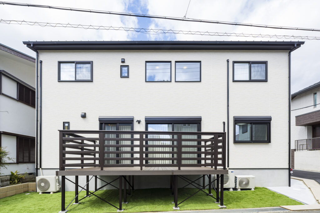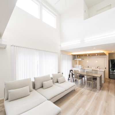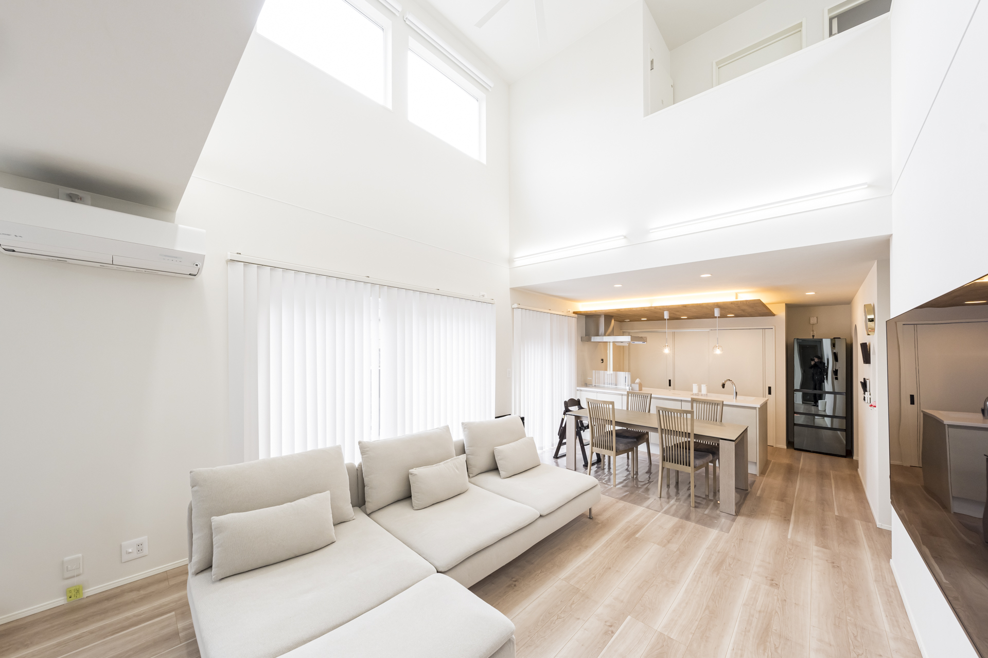 25帖を超えるLDKは大きな吹き抜けで開放感抜群! 優しい光が差し込む心地よい大空間に仕上がりました。 LDKから続くウッドデッキはご家族様の憩いの場になることでしょう。