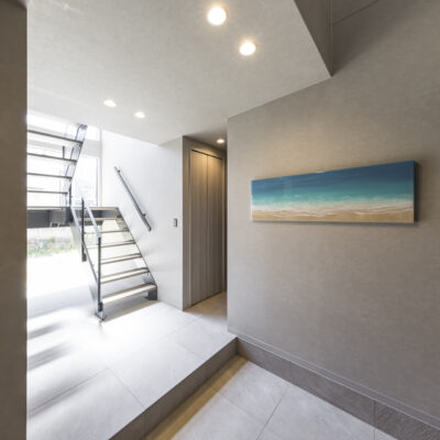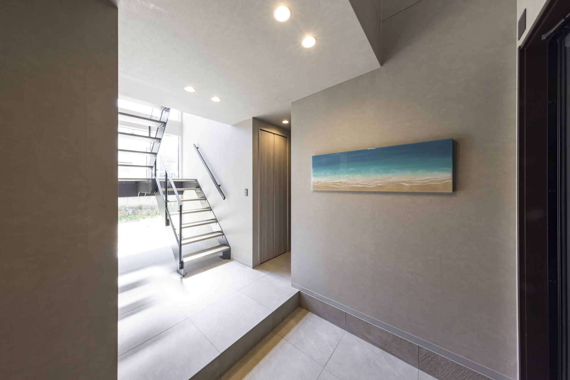 大きなガラス窓と吹抜けとオープン階段のおかげで 1階玄関も明るく、奥行き感のある空間に仕上がりました。