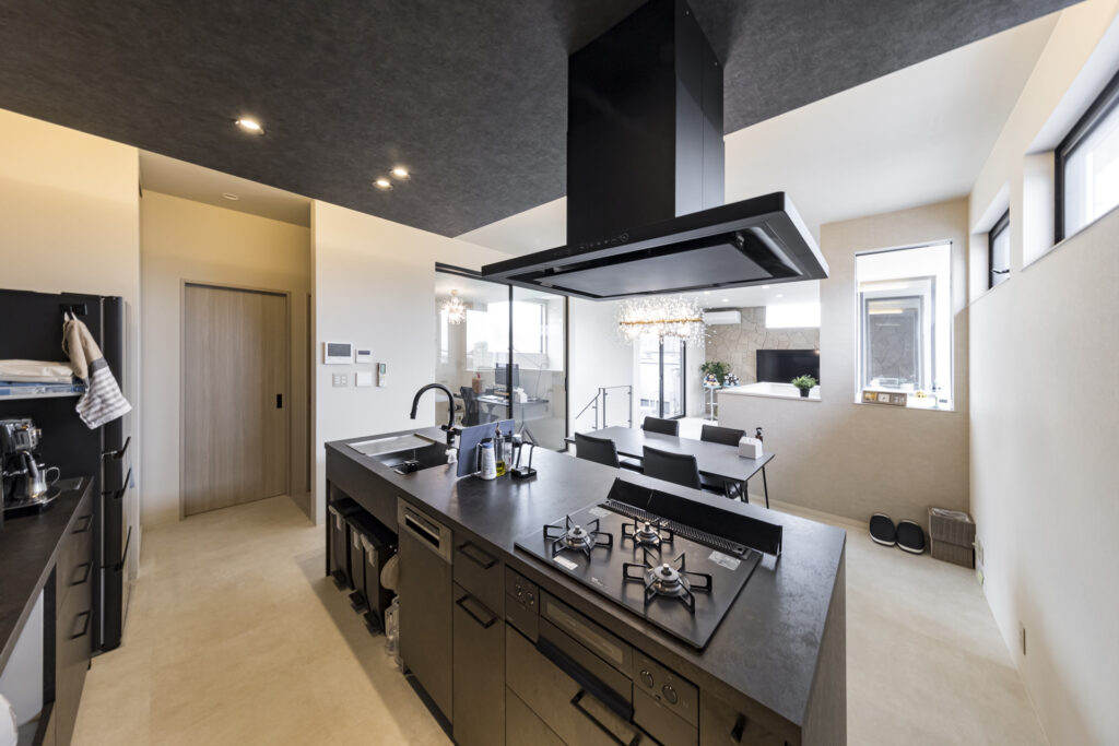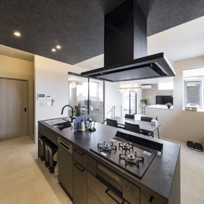 ひときわ目を引くアイランド型のキッチンは スタイリッシュなブラックで奥様こだわりのデザインです。