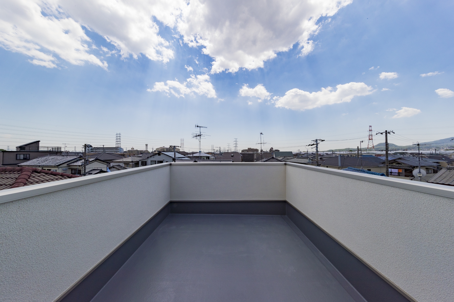 屋外には8.5帖の広々ルーフバルコニーを設置。約2mの軒を備えているため、洗濯物もたっぷり干せ、急な雨の日でも安心です。