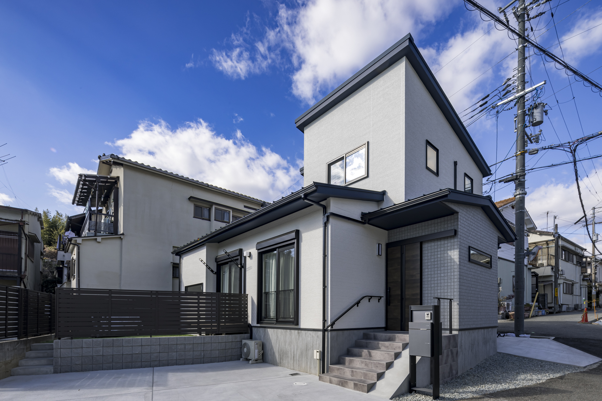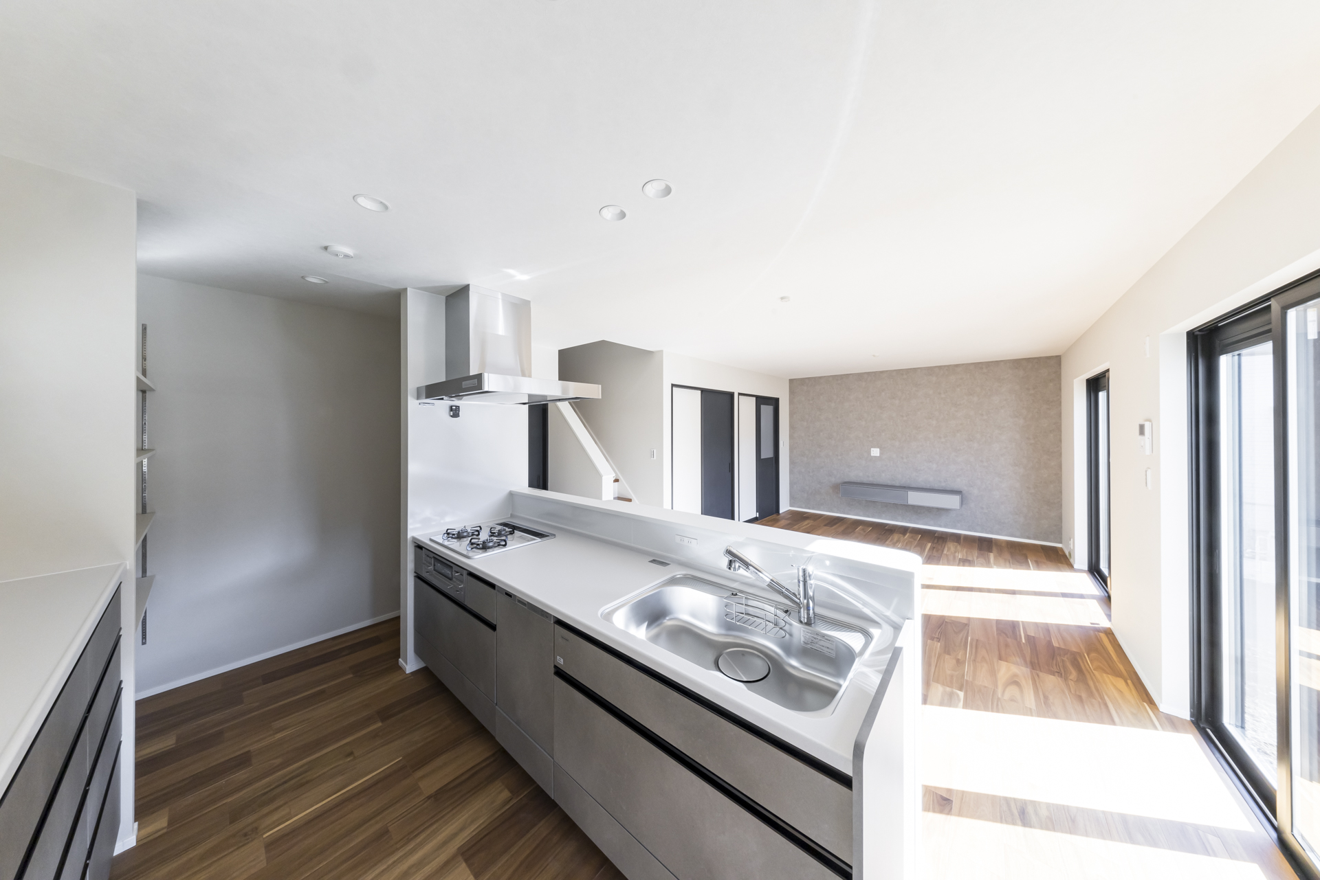 見る角度によって表情を変える外観は、ホワイトを基調としたシンプルなデザイン。 大きな窓から光がたっぷり差し込むLDKには、キッチン横のカウンターや庭へつながる濡縁を設けました。
